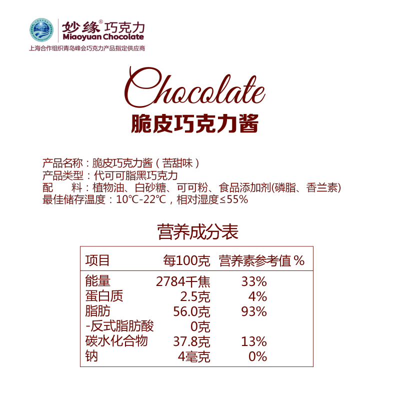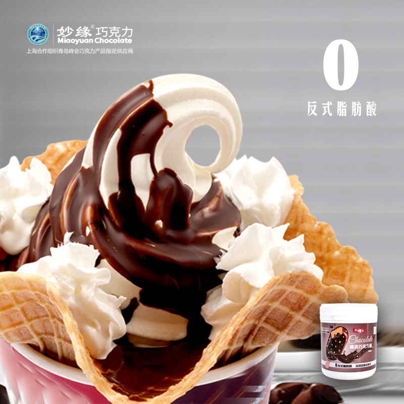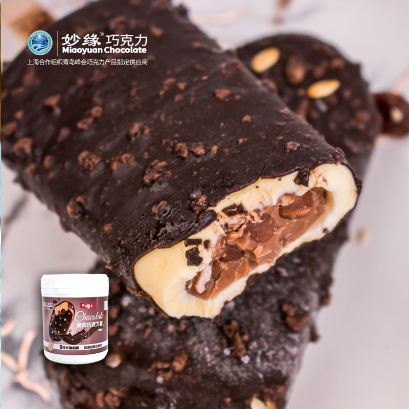 妙缘巧克力脆皮冷饮酱,也称巧克力脆皮酱,采用进口可可原料加工而成,直接融化后使用,操作简单快捷,凝固速度快,成品裹衣均匀,酥脆可口。主要用于冷饮方面冰激凌、雪糕的巧克力表面脆皮、裹衣等,