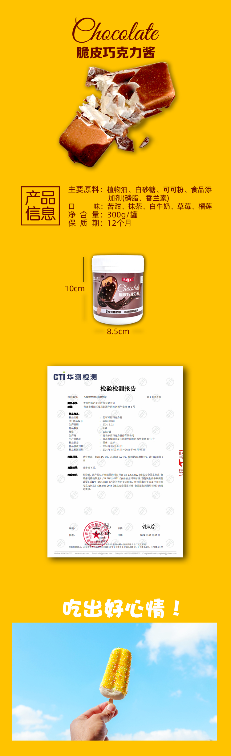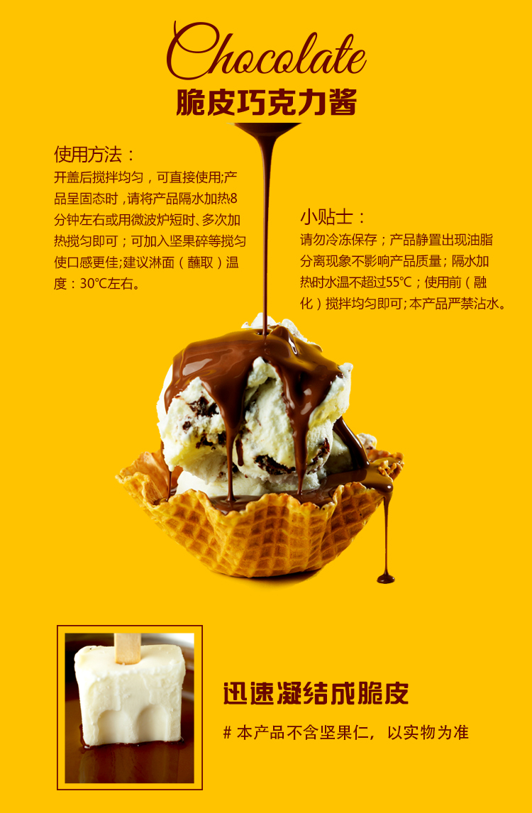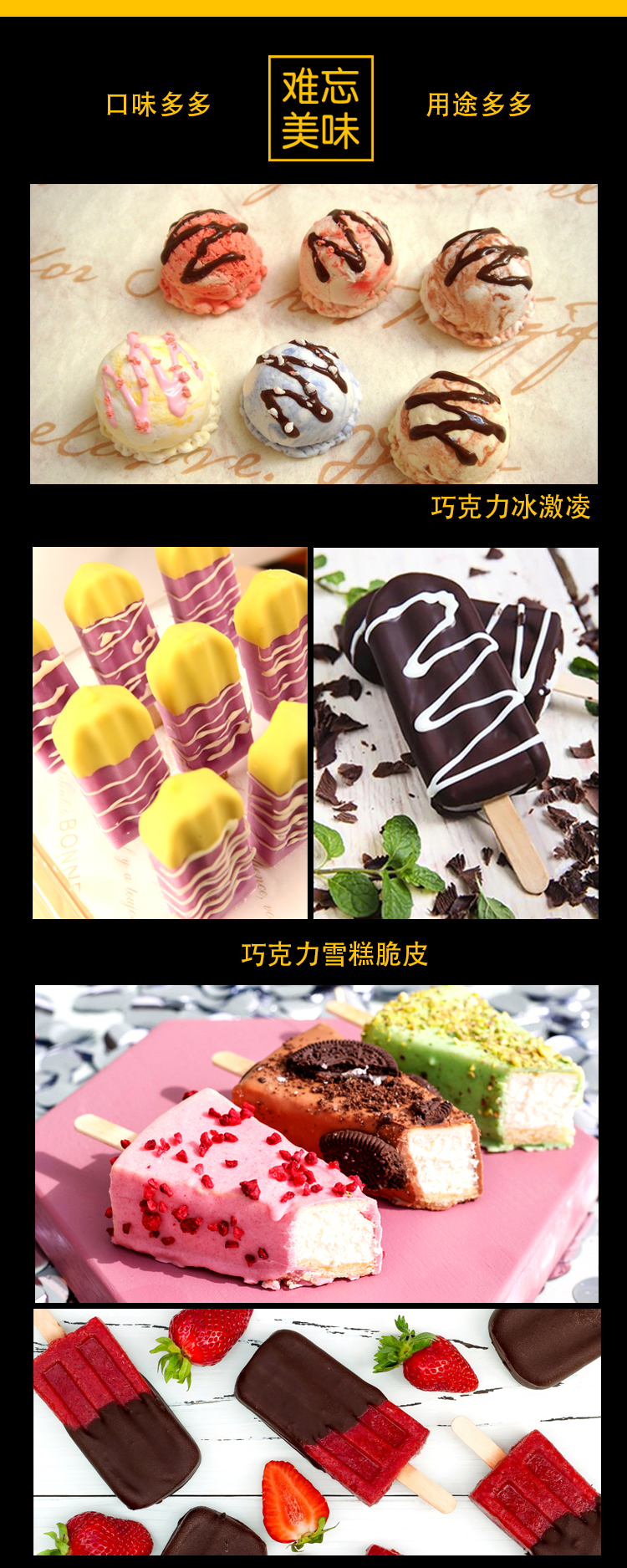 产品分类: 妙缘巧克力脆皮冷饮酱产品形态:液态产品口味:苦甜味、草莓味、抹茶味、蓝莓味、菠萝味、香蕉味、白牛奶味等(可定制)产品使用:主要用于冷饮方面冰激凌、雪糕的巧克力表面脆皮、裹衣等