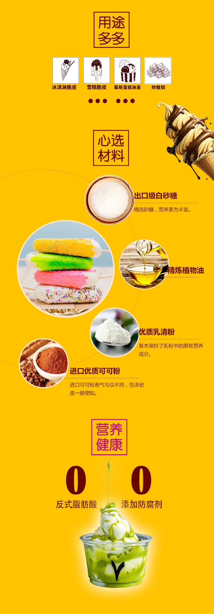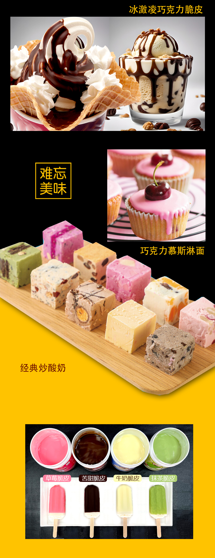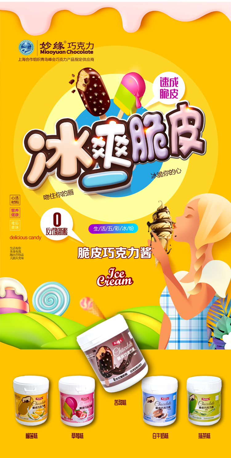 产品分类: 妙缘巧克力脆皮冷饮酱产品形态:液态产品口味:苦甜味、草莓味、抹茶味、蓝莓味、菠萝味、香蕉味、白牛奶味等(可定制)产品使用:主要用于冷饮方面冰激凌、雪糕的巧克力表面脆皮、裹衣等