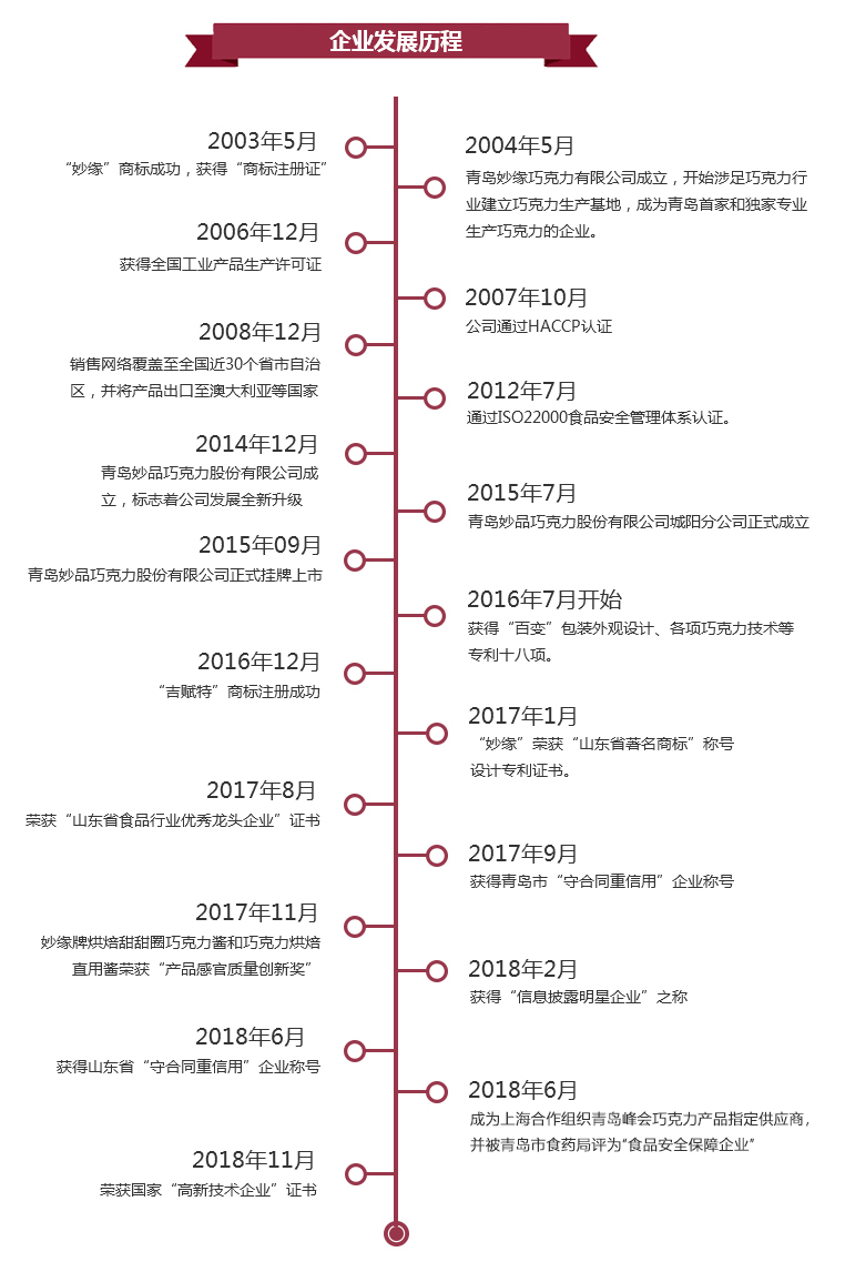 自2004年,青岛妙品巧克力股份有限公司已发展成为集研发、生产、销售为一体的专业化巧克力企业,拥有10余条先进生产线的标准化工厂,拥有“妙缘”(2017年获得山东省著名商标称号),吉赋特等十多个商标,三十几项巧克力专利技术,2018年荣获国家“高新技术企业”证书。 专业化的销售团队实现线下线上多渠道覆盖, 营销网络已遍及全国三十几个省、市、自治区并出口澳洲、东南亚、北韩等国家,并获得了多项荣誉: