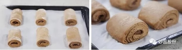 3、卷好的小面团放在铺了油纸的烤盘里,每个小面团之间要留出足够的距离。温度26℃湿度75%左右,发酵45-50分钟左右,直到面团变成约8成;