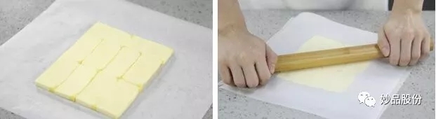 4、将片状油切成片,在油纸上盖一层油纸,用擀面杖擀一擀,使黄油片变得更薄一点。