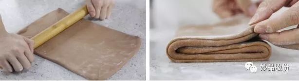 6、将面团再次擀开,擀成一个长方形,从面团的一端1/3处折叠过来,将另一端也折叠过去。将折好的面团包上保鲜膜,放入冰箱冷藏15-20分钟,使面团得到充分的松弛,并保持面团的低温。