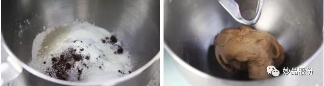 1、高筋粉、低筋粉、干酵母、奶粉搅拌均匀,加入细砂糖、鸡蛋牛奶、妙缘巧克力烘焙直用酱(60%)用搅拌机搅匀(也可以用手揉)。搅拌机开2档,搅打面团至6成左右。