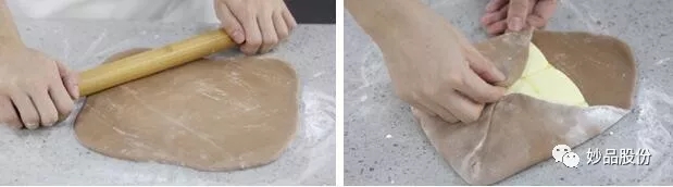 5、台面上撒一些干面粉防粘,将冷藏好的面团擀开,大小是可以将面团的四个角向中间折叠过来,将黄油片包裹住,将面团的接缝处捏紧。