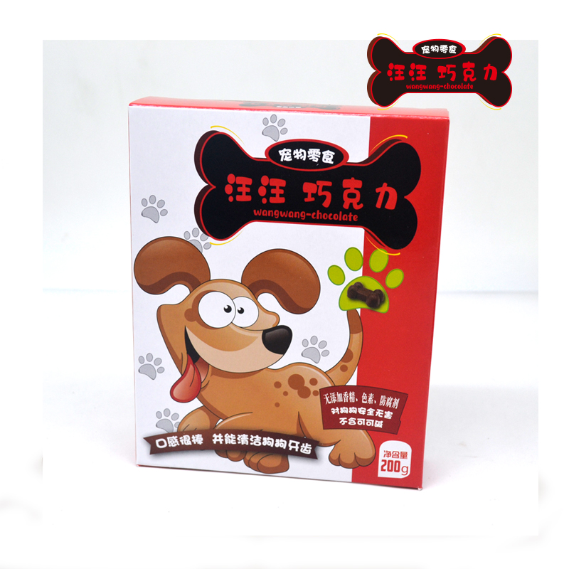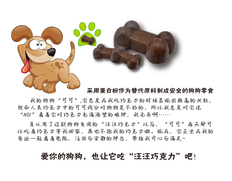 产品分类: 汪汪巧克力产品形态:骨头状产品口味:巧克力风味产品使用:巧克力风味狗狗零食,目前已畅销美国、澳大利亚等国,可定制