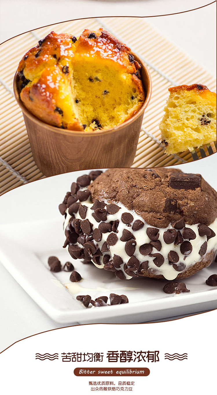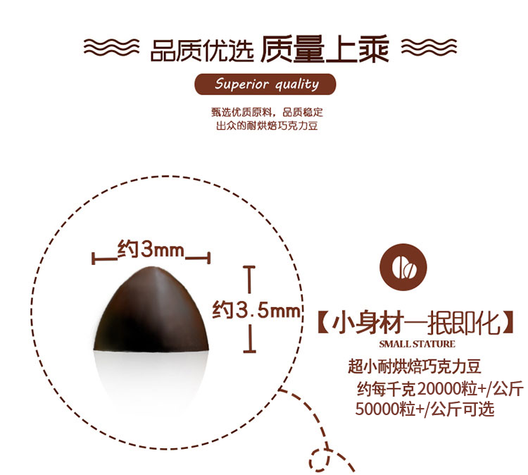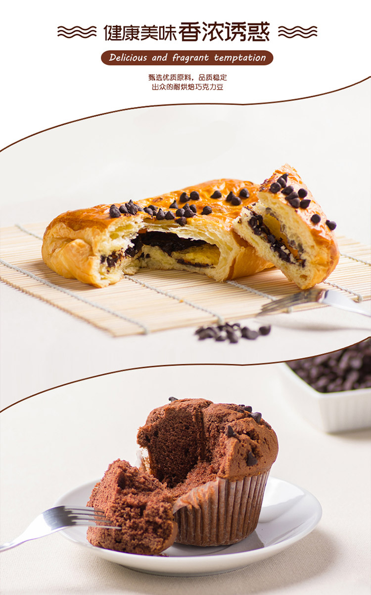 产品分类: 产品中心产品形态:巧克力豆产品口味:苦甜产品使用:570g/袋*10/箱,可用于表面装饰,内部夹心馅料等